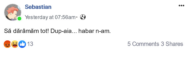 După părerea lui Sebi, întreaga civilizație a ajuns într-un moment critic, în care nimic nu e cum ar trebui să fie. Doar așa își poate explica de ce nu își găsește locul și rostul și poate chiar motivul pentru tendințele sale anti-sociale din cauza cărora intră de multe ori în bucluc. Fiindcă nu poate defini clar cum anume ar trebui să arate societatea ideală, el ar fi mulțumit doar să manevreze mingea de demolări, lăsând apoi pe alții, mai inspirați, să construiască ceva mai bun.